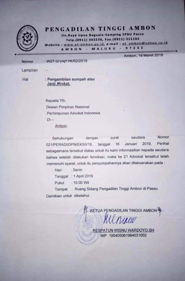 Bahwa berdasarkan surat dari Pengadilan Tinggi Ambon Nomor: W27.U/425/HK/02/2019 tertanggal 19 Maret 2019 akan dilakukan pengambilan Sumpah atau Janji Advokat, dengan ketentuan hal-hal sebagai berikut :