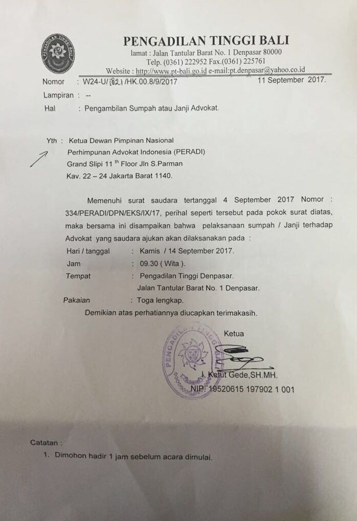Bahwa berdasarkan surat dari Pengadilan Tinggi Bali Nomor: W24.U/1821/HK.00.8/9/2017 tertanggal 11 September 2017 akan dilakukan pengambilan Sumpah atau Janji Advokat, dengan ketentuan hal-hal sebagai berikut :