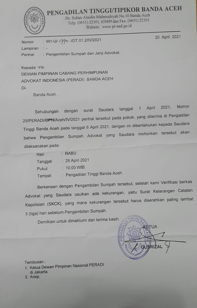 Bahwa berdasarkan surat dari Pengadilan Tinggi Banda Aceh Nomor: W1-U/1770/OT.01.2/IV/2021 tertanggal 20 April 2021 akan dilakukan pengambilan Sumpah atau Janji Advokat, dengan ketentuan hal-hal sebagai berikut :