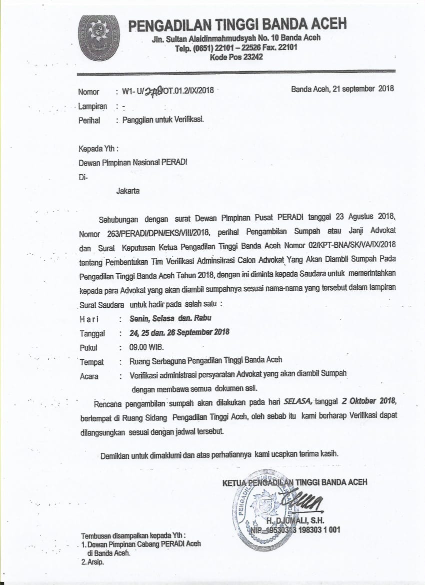 Bahwa berdasarkan surat dari Pengadilan Tinggi Banda Aceh Nomor: W1.U/2718/OT.01.2/IX/2018 tertanggal 21 September 2018 akan dilakukan pengambilan Sumpah atau Janji Advokat, dengan ketentuan hal-hal sebagai berikut :