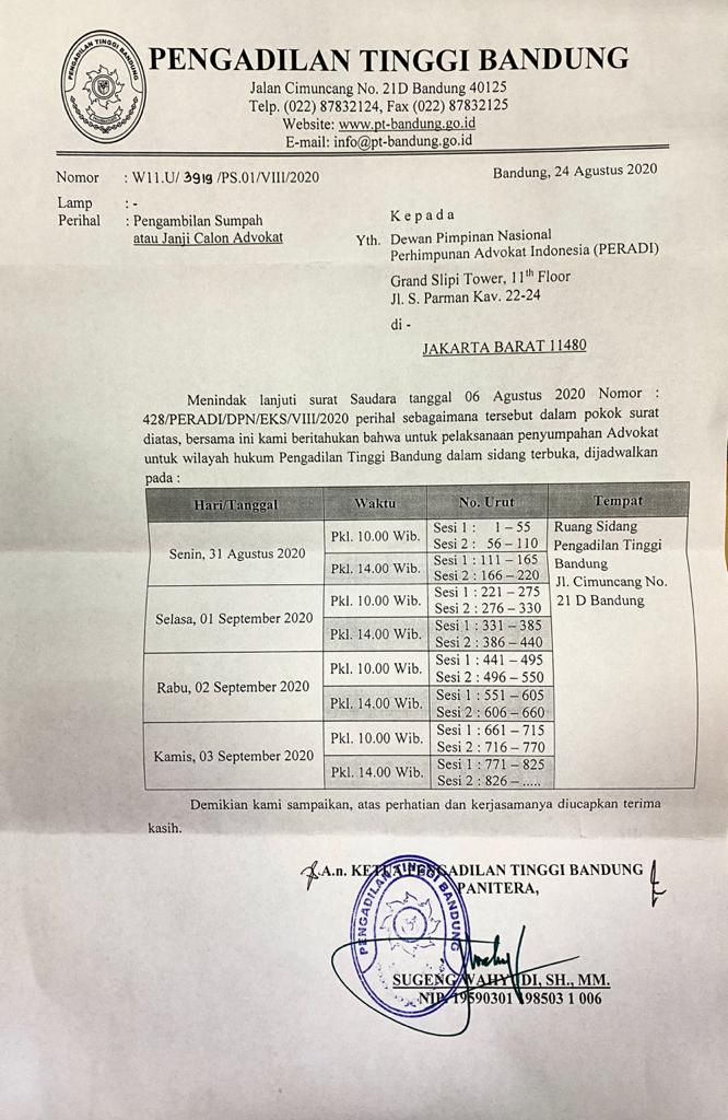 Bahwa berdasarkan surat dari Pengadilan Tinggi Bandung Nomor: W11-U/3919/PS.01/VIII/2020 tertanggal 24 Agustus 2020 akan dilakukan pengambilan Sumpah atau Janji Advokat, dengan ketentuan hal-hal sebagai berikut :
