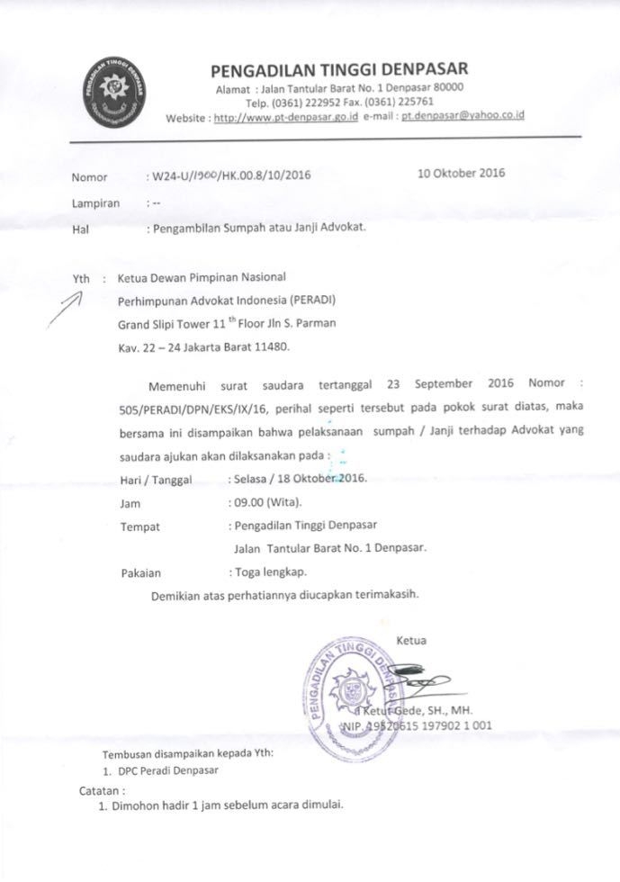 Bahwa berdasarkan surat dari Pengadilan Tinggi Denpasar Nomor: W24.U/1900/HK.00.8/10/2016 tertanggal 10 Oktober 2016 akan dilakukan pengambilan Sumpah atau Janji Advokat, dengan ketentuan hal-hal sebagai berikut :