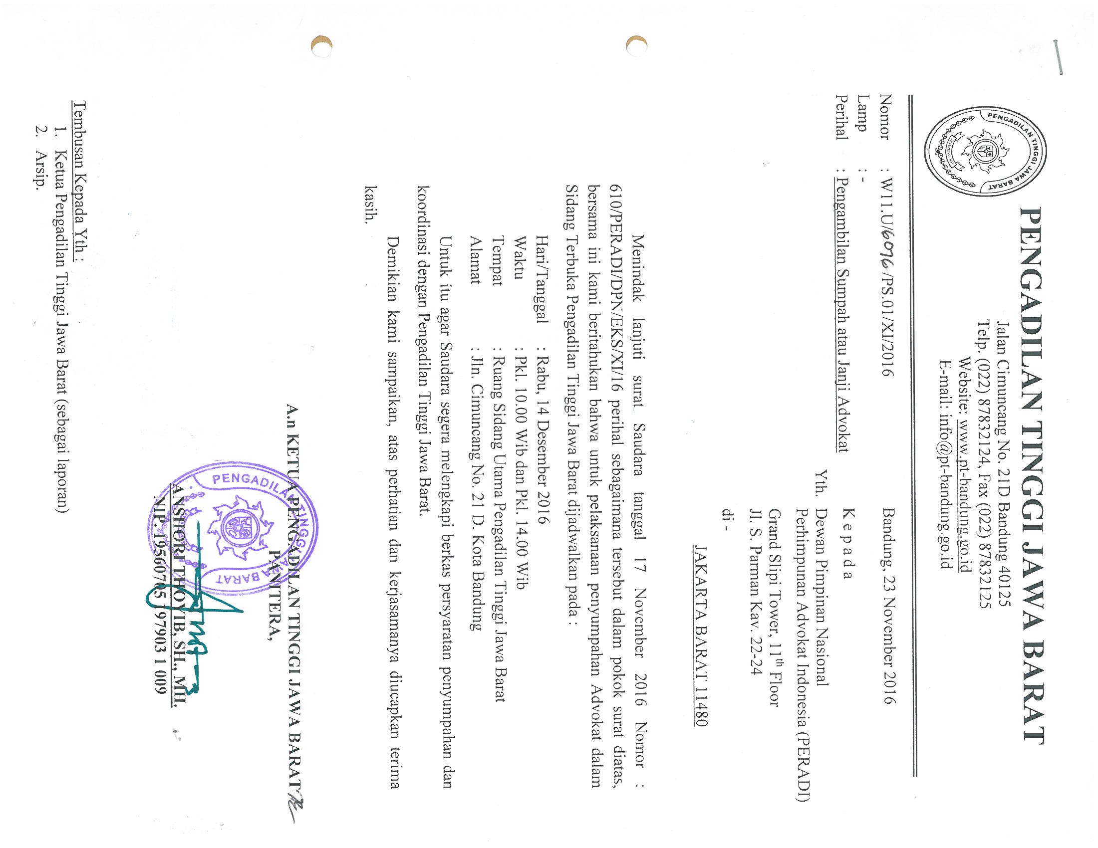 Bahwa berdasarkan surat dari Pengadilan Tinggi Jawa Barat Nomor: W11.U/6076/PS.01/XI/2016 tertanggal 23 November 2016 akan dilakukan pengambilan Sumpah atau Janji Advokat, dengan ketentuan hal-hal sebagai berikut: