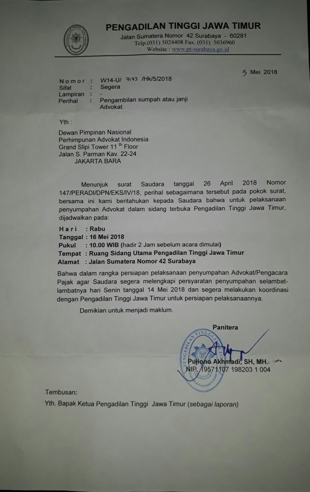 Bahwa berdasarkan surat dari Pengadilan Tinggi Jawa Timur Nomor: W14-U/3133/Hk/5/2018 tertanggal 9 Mei 2018 akan dilakukan pengambilan Sumpah atau Janji Advokat, dengan ketentuan hal-hal sebagai berikut :