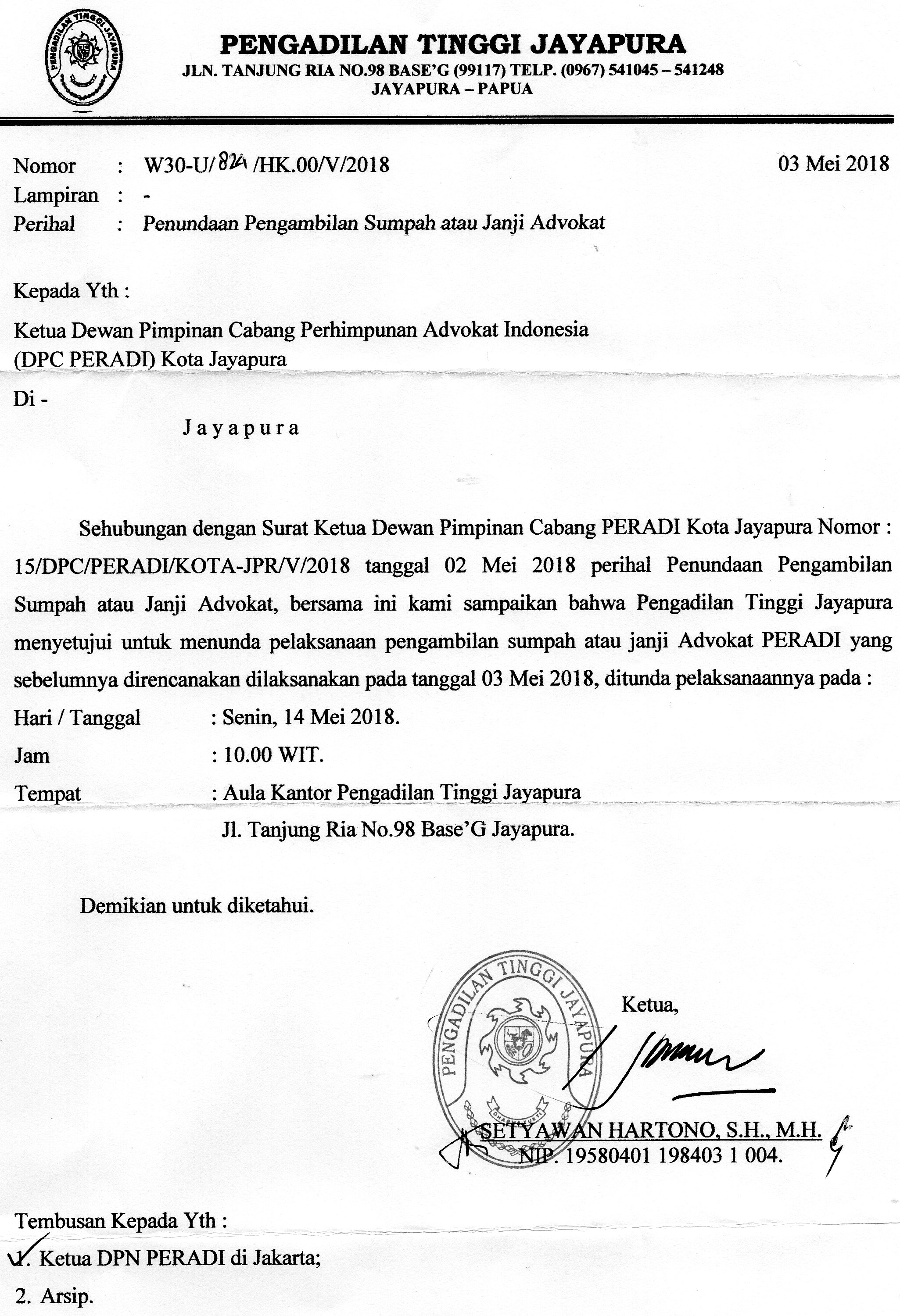 Bahwa berdasarkan surat dari Pengadilan Tinggi Jayapura Nomor: W30.U/824/HK.00/V/2018 tertanggal 3 Mei 2018 akan dilakukan pengambilan Sumpah atau Janji Advokat, dengan ketentuan hal-hal sebagai berikut :