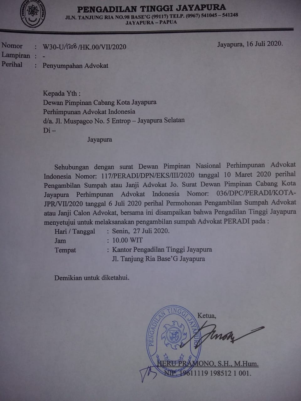Bahwa berdasarkan surat dari Pengadilan Tinggi Jayapura Nomor: W30-U/1208/HK.00/VII/2020 tertanggal 16 Juli 2020 akan dilakukan pengambilan Sumpah atau Janji Advokat, dengan ketentuan hal-hal sebagai berikut :