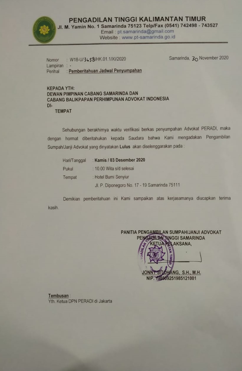 Bahwa berdasarkan surat dari Pengadilan Tinggi Kalimantan Timur Nomor: W18-U/3658/HK.01.1/XI/2020 tertanggal 30 November 2020 akan dilakukan pengambilan Sumpah atau Janji Advokat, dengan ketentuan hal-hal sebagai berikut :