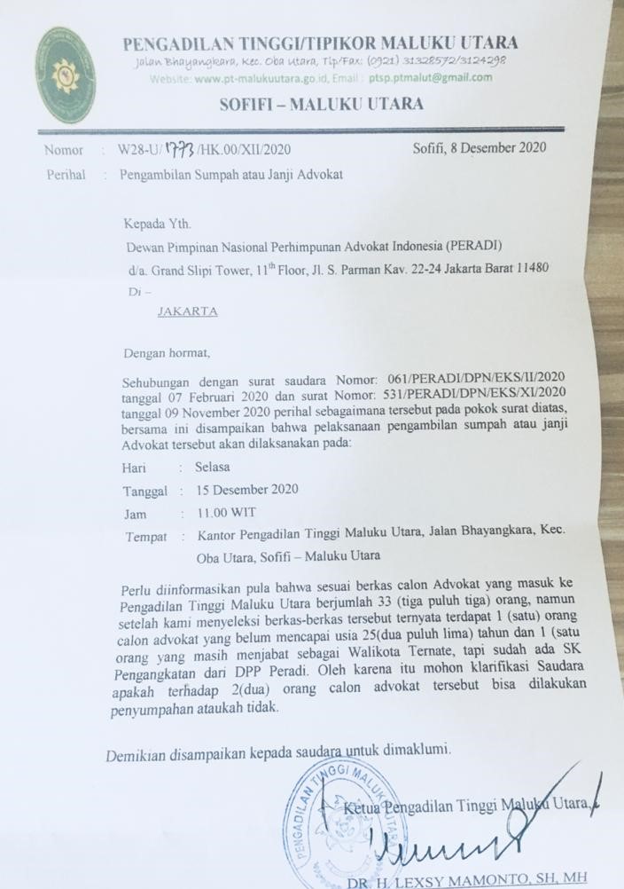 Bahwa berdasarkan surat dari Pengadilan Tinggi Maluku Utara Nomor: W28-U/1773/HK.00/XII/2020 tertanggal 8 Desember 2020 akan dilakukan pengambilan Sumpah atau Janji Advokat, dengan ketentuan hal-hal sebagai berikut :
