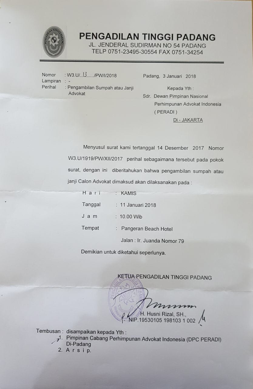 Bahwa berdasarkan surat dari Pengadilan Tinggi Padang Nomor: W3.U/13/PW/I/2018 tertanggal 3 Januari 2018 akan dilakukan pengambilan Sumpah atau Janji Advokat, dengan ketentuan hal-hal sebagai berikut :