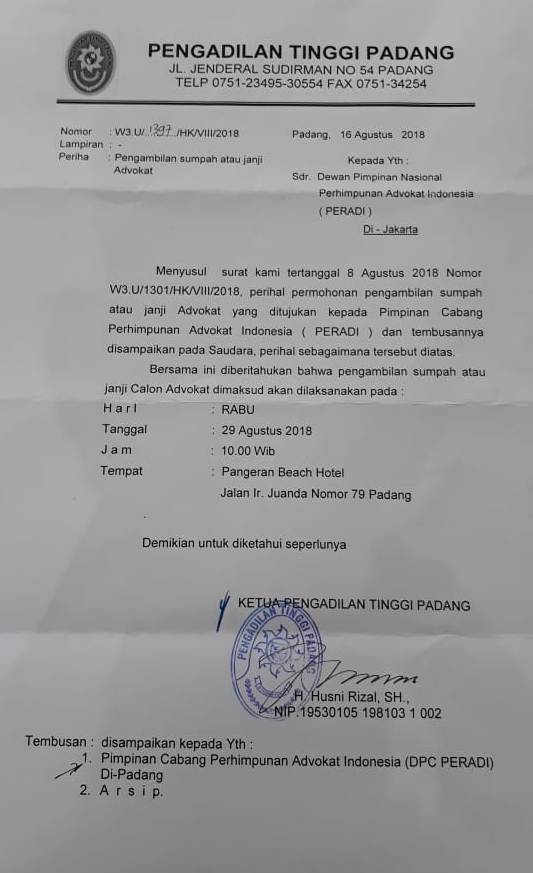 Bahwa berdasarkan surat dari Pengadilan Tinggi Padang Nomor: W3.U/1397/HK/VIII/2018 tertanggal 16 Agustus 2018 akan dilakukan pengambilan Sumpah atau Janji Advokat, dengan ketentuan hal-hal sebagai berikut :