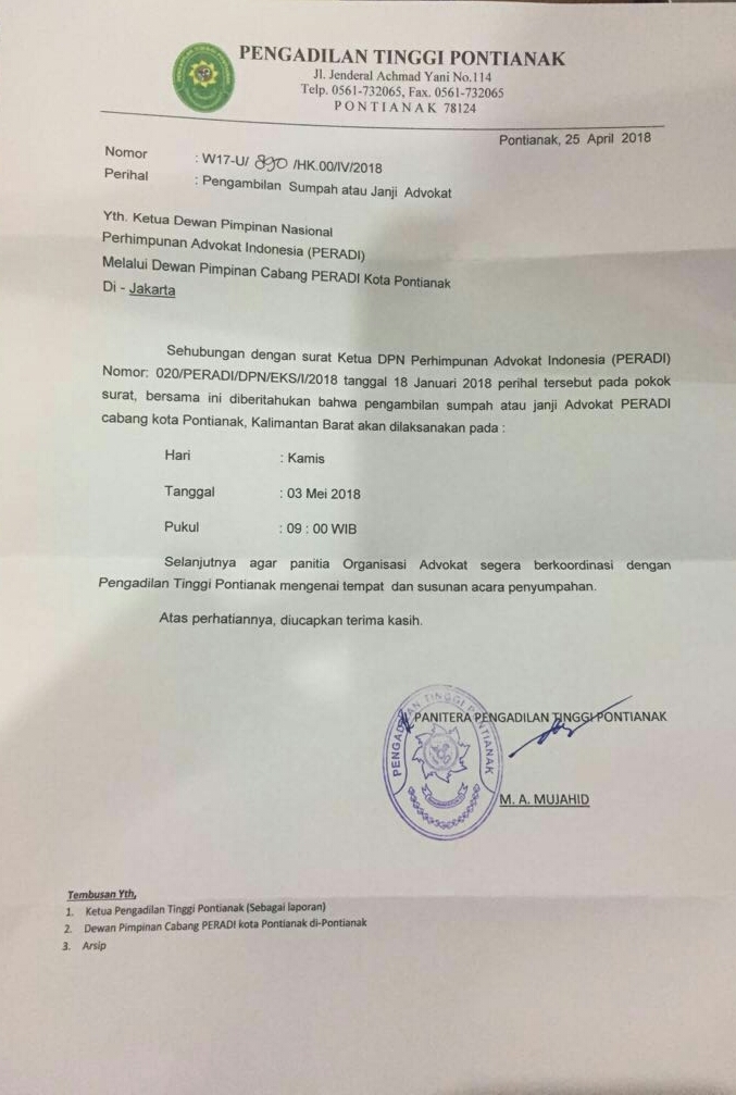 Bahwa berdasarkan surat dari Pengadilan Tinggi Pontianak Nomor: W.17-U/890/HK.00/IV/2018 tertanggal 25 April 2018 akan dilakukan pengambilan Sumpah atau Janji Advokat, dengan ketentuan hal-hal sebagai berikut :