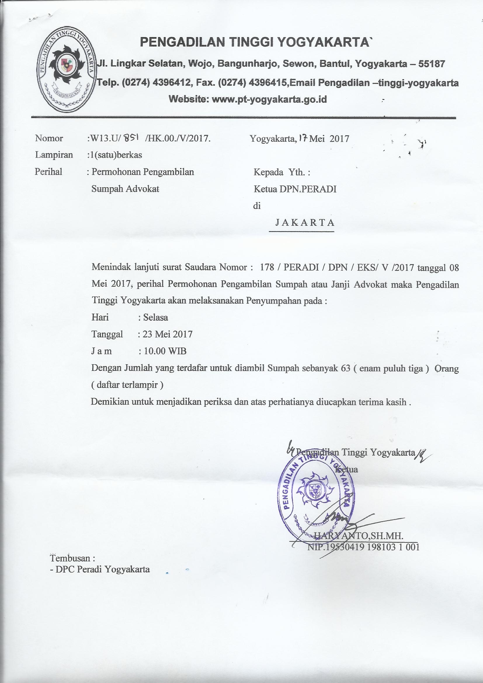 Bahwa berdasarkan surat dari Pengadilan Tinggi Yogyakarta Nomor: W13.U/851/HK.00./V/2017 tertanggal 17 Mei 2017 akan dilakukan pengambilan Sumpah atau Janji Advokat, dengan ketentuan hal-hal sebagai berikut :